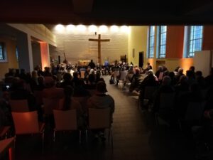 Los ging es mit dem Saxophon-Ensembel der MKS Duisburg. 12 Saxophonistinnen und Saxophonisten unter der Leitung von Guido Grospitsch nahmen die etwa 100 Konzertbesucher*innen allein durch ihre Melodien mit – vom Swinging City Blues zum Ghibli Medley, das hier deutschlandweite Premiere feierte. Manchmal ging es wild durcheinander, manchmal wurde es sehr ruhig und immer war es eine Spielfreude und Vielfältigkeit, die das Publikum tief berührte.
