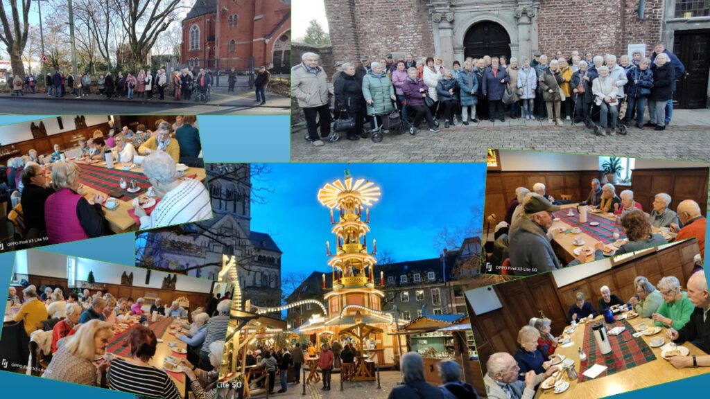 Am 4.Dezember machte die Bonhoeffer-Gemeinde in Kooperation mit dem BBZ Marxloh (EDD) einen Ausflug zum Nikolauskloster nach Jüchen. Das Kloster wurde als Hauskloster des Schlosses der Familie Dyck und den Grafen Salm-Reiferscheid 1403 gebaut. In malerischer Landschaft gelegen, haben wir dort mit einer 50 Personen Gruppe von Senioren und Seniorinnen ein leckeres Kaffeetrinken vom Buffet genossen. Einen Klosterladen gab es auch. Hier wurde dann noch ein Gruppenfoto gemacht bevor es dann in einer schön anzusehenden Sonnenuntergangsstimmung zum Weihnachtsmarkt nach Neuss ging. Dieser liegt mitten in der Innenstadt an der katholischen Stadtkirche St. Quirinus. Ein kleiner aber sehr feiner, stimmungsvoller Weihnachtsmarkt. Der Vollmond am Himmel setzte dem noch eine Krone auf. Auch Glühwein, Reibekuchen und Bratwurst waren sehr lecker. Zurück ging es am frühen Abend mit unserem sehr freundlichen Busfahrer von Graf Reisen in die Heimat. Alle waren sehr zufrieden und wurden mit guten Weihnachtswünschen und Einladungen zu diversen Gottesdiensten und Festterminen der Gemeinde und des BBZ verabschiedet.