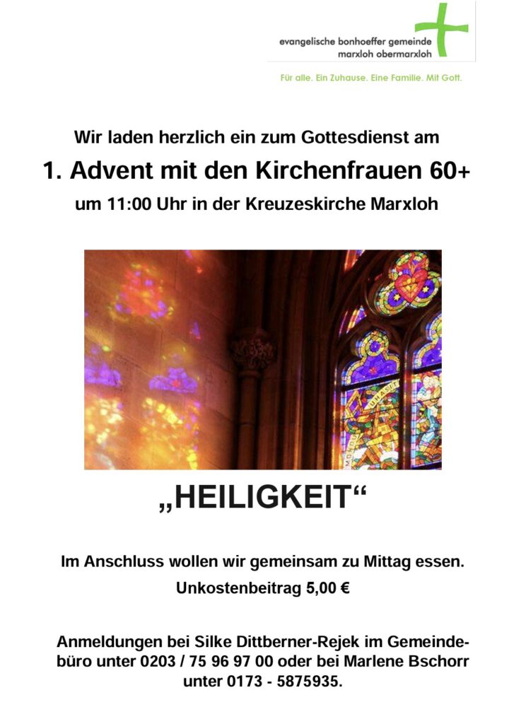 Wir laden herzlich ein zum Gottesdienst am 1. Advent, den die Kirchenfrauen 60+ gestalten. Gemeinsam möchten wir uns auf den Beginn der Adventszeit einstimmen und dem Thema „Heiligkeit“ nachspüren.