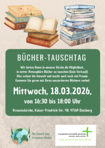 Des Weiteren soll es einen Bücher-Tausch-Tag, einen Trödelmarkt, zwei Clean Up-Aktionen rund um die beiden Kirchen und eine Samenbomben-Bastel-Aktion geben. Außerdem suchen wir Leute, die Interesse haben an einem Repair-Cafè mitzuwirken und sammeln Kronkorken, um diese als Sammelspende abzugeben. Es ist einiges los hier! 🙂