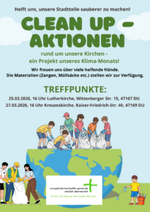Der März dreht sich in der Bonhoeffer Gemeinde rund um das Thema „Bewahrung der Schöpfung“. Daher haben wir mit verschiedenen Kooperationen ein buntes Programm im Sinne der Nachhaltigkeit auf die Beine gestellt, an dessen Umsetzung gern teilgenommen werden darf. Gestartet wird mit einem Gottesdienst zum Thema, am 1. März um 11 Uhr in der Lutherkirche. Im direkten Anschluss wird die „Klima-Ausstellung“ der Kooperationspartner*innen von Parents for Future Duisburg eröffnet. Diese wird den gesamten März über im Foyer des Familienzentrums zu den regulären Öffnungszeiten zu sehen sein.