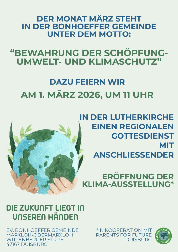 Wie bereits angekündigt s0ll der März dieses Jahr ganz unter dem Motto „Bewahrung der Schöpfung“ stehen. Dazu laden wir auch zu einem besonderen Gottesdienst ein: am 1.März um 11 Uhr in der Lutherkirche. Im Anschluss wird die Klima-Ausstellung, die in Zusammenarbeit mit den Parents For Future Duisburg für einige Zeit in der Kirche zu sehen sein wird, eröffnet.